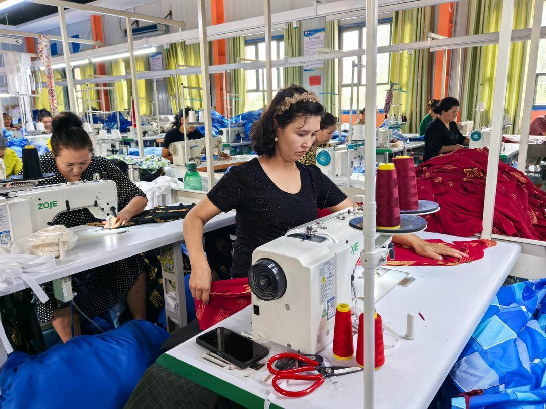 在共富工坊,村民麦热木古丽•图尔荪正在赶制一批服装订单,她高兴地说:“在家门口就能挣到钱,还能照顾家,真是太幸福了!”
